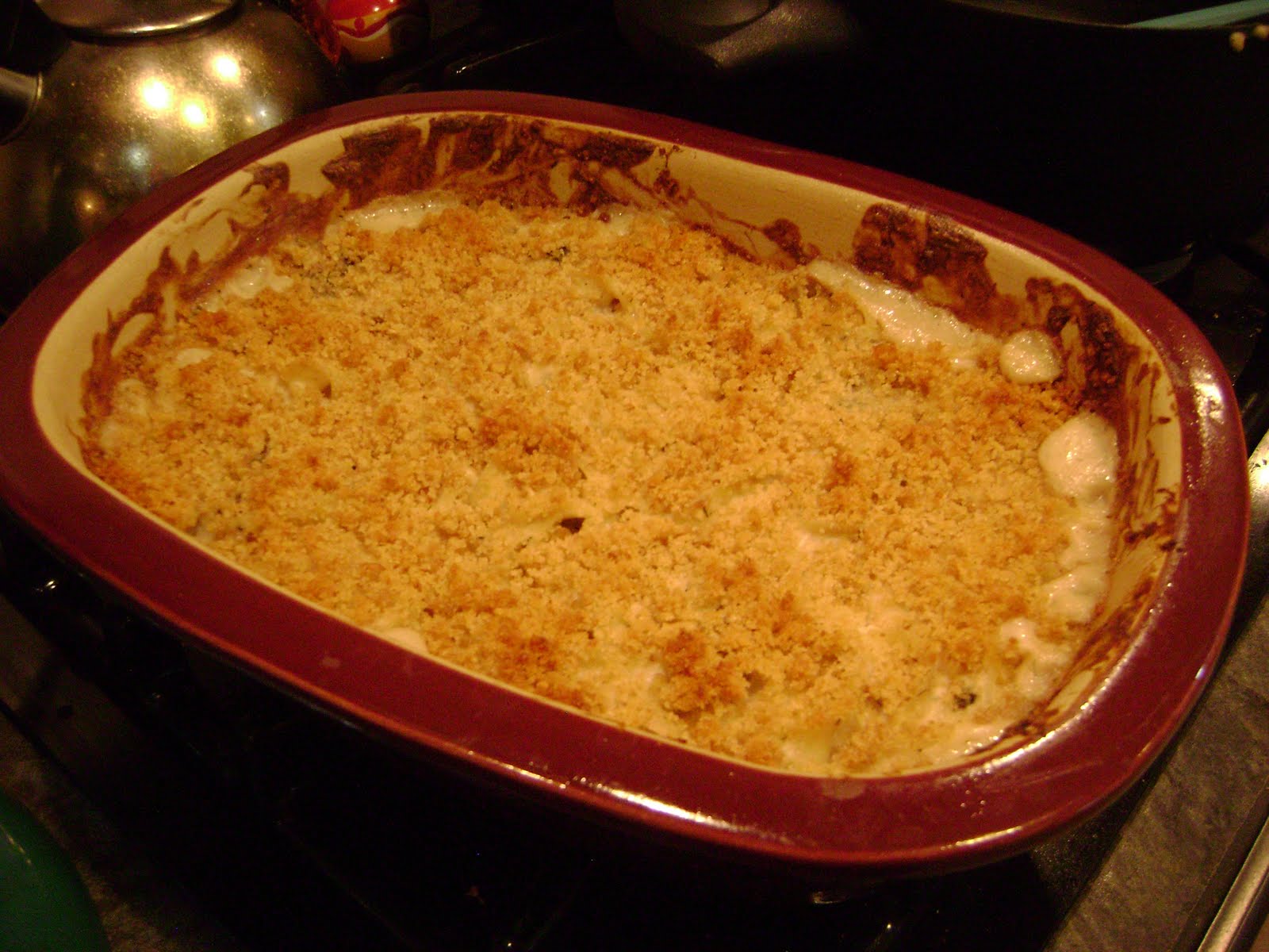 4. In a small bowl, combine the dry bread crumbs and the melted butter. Sprinkle over the top of the casserole, and place in the oven.