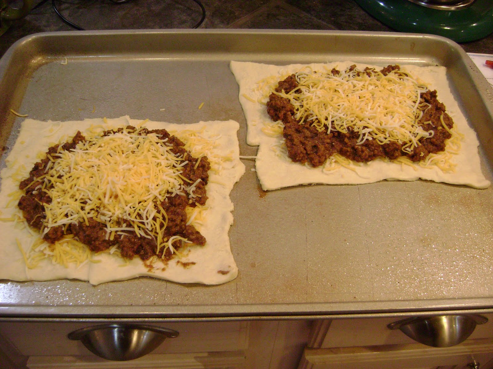 5. Next, spoon a generous helping of the meat, bean, and sauce mixture onto the middle of the pastry squares.