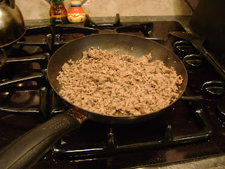 2. Next, brown hamburger or turkey meat in pan and drain.